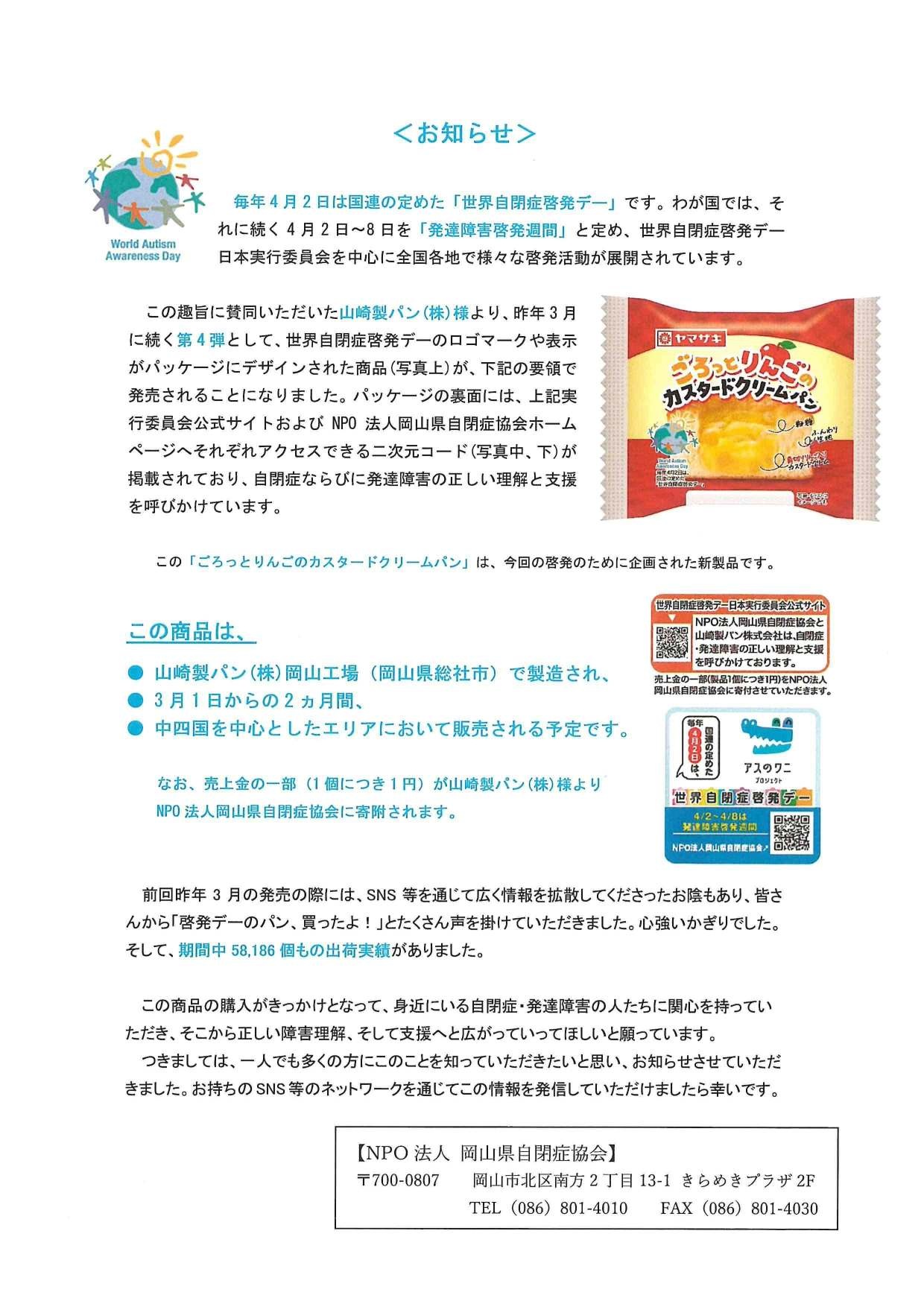今年もコラボ企画!! 昨年に続き第4弾です。 この商品は山崎製パン(株) 岡山工場(岡山県総社市)で 製造され3月1日より2か月間、 中四国を中心としたエリアにての 限定販売です。 詳しくはこちらから。 チラシはこちらから。 SNS、口コミなどでのPR,拡散をどうぞよろしくお願いいたします。 |