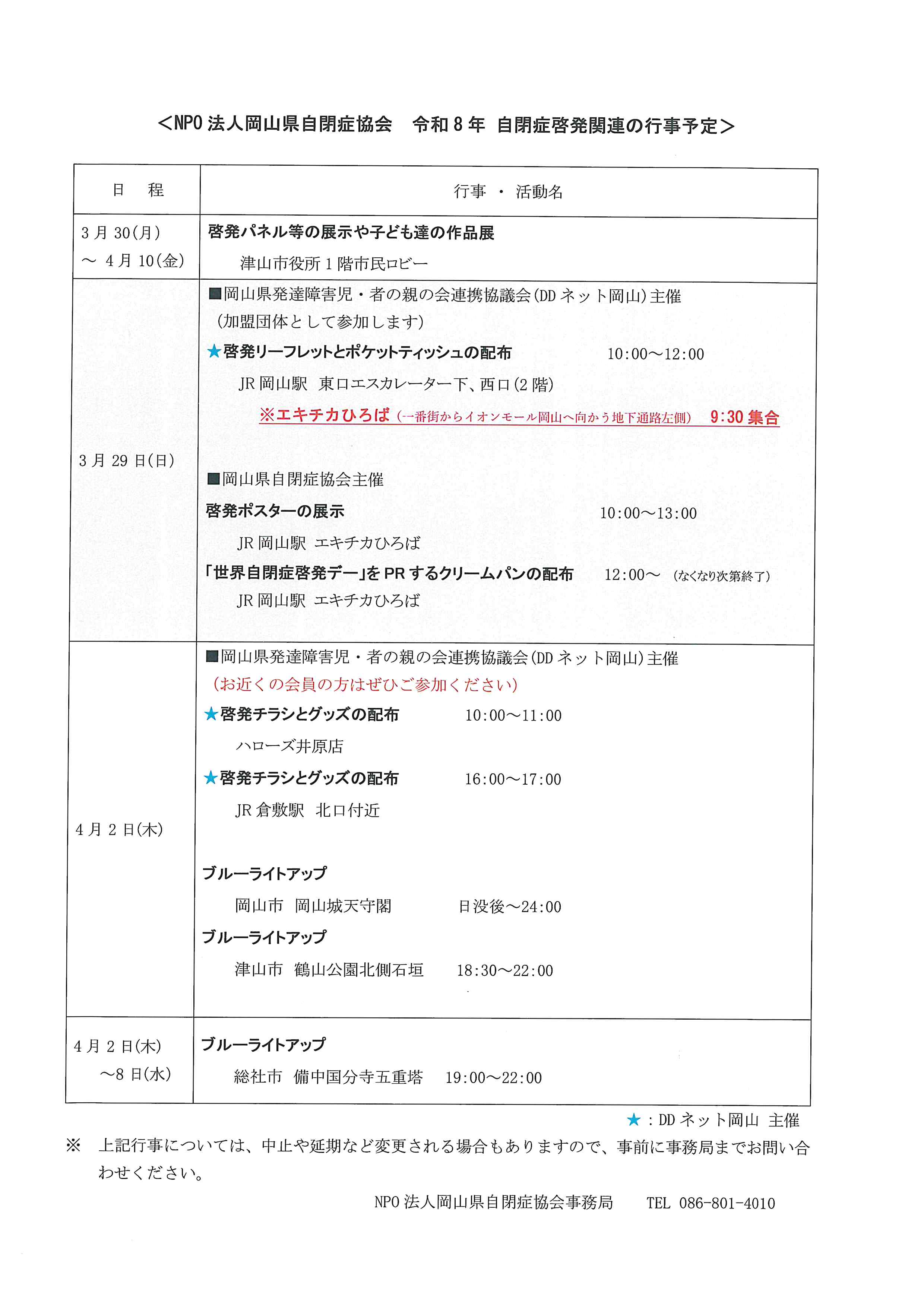 | 今年も様々な啓発関連の行事が予定されています。 3月29日(日)10時から13時まで JR岡山駅 エキチカ広場にて 啓発ポスター等の展示と合わせて 「世界自閉症啓発デー」をPRするクリームパンの配布を12時から行います。 (こちらはなくなり次第終了となります) 3月29日(日)10時より 岡山県発達障害児・者親の会連携協議会(DDネット岡山)の加盟団体として JR岡山駅 東口 西口での啓発リーフレット等の配布行います。 ブルーライトアップ 岡山市 岡山城 天守閣 (4/2 日没後~24:00) 津山市 鶴山公園 北側石垣 (4/2 18:30~22:00) 総社市 備中国分寺 五重塔 (4/2~4/8 19:00~22:00) 詳しくはこちらから お手伝いいただける方は事務局までご連絡ください。 |